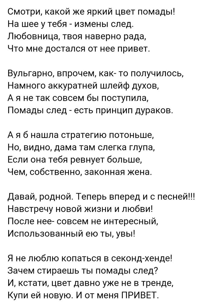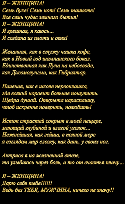 Когда тебя качает… от усталости, …Когда потерян счёт твоим… делам, Не позволяй себе рыдать… от жалости, …Не дай сложиться, двум твоим … крылам………… Ещё , ты помни, что ты… чудо – женщина! …Что ты, прекрасна… и душой светла, Тебе, счастливой быть… судьбой, завещано- …Не опускай, прекрасных… два, крыла!!! Т.Пожидаева………………………………? — Обсуждай