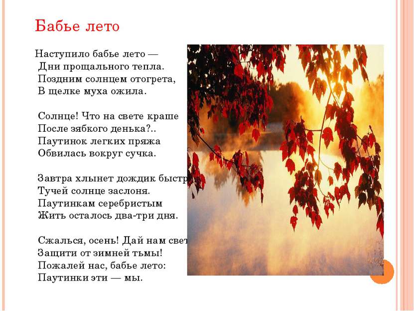 5 Название «Бабье лето». Дословное определение: «период не по сезону теплая и сухая погода, которая иногда бывает осенью в Северном полушарии.Значение стихотворения: бабье лето — это редкий случай, как и то, как редко бывает принятие себя и осознание того, что человек не может угодить всем.
