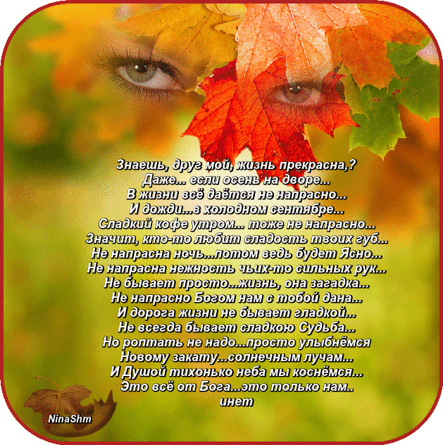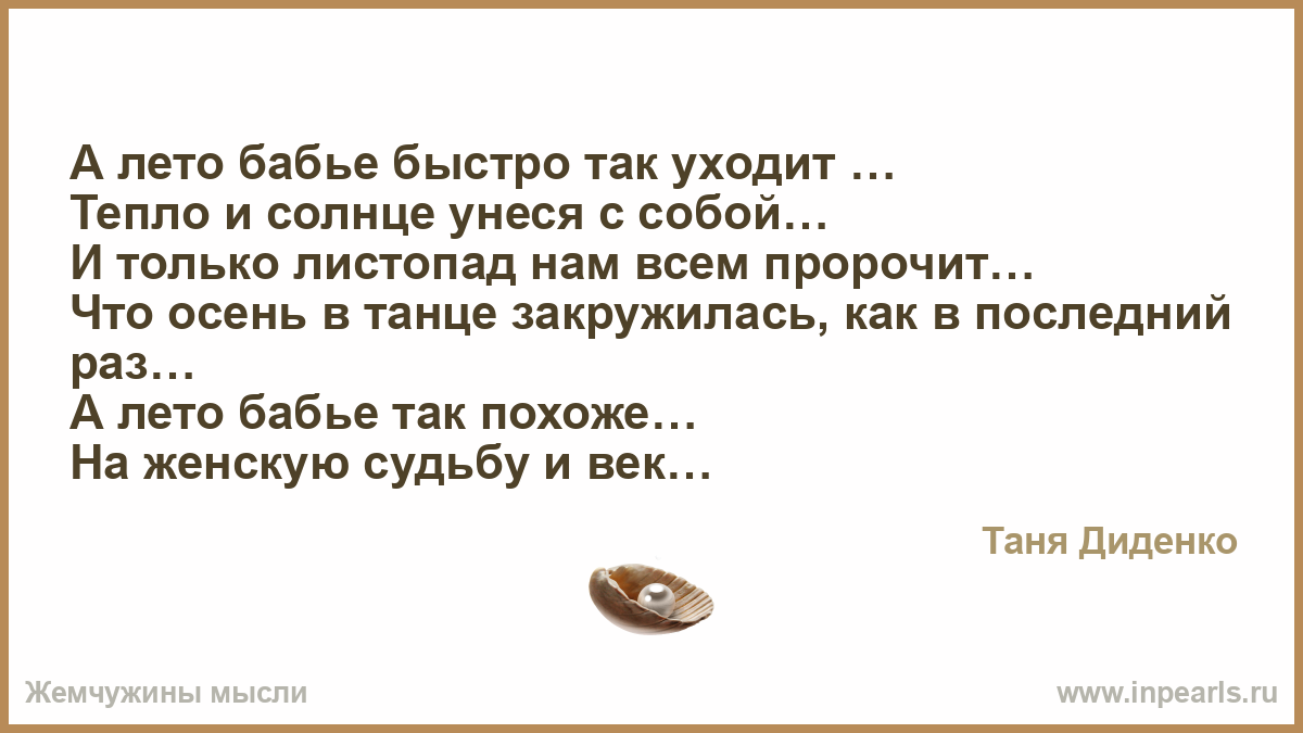 6 Парафраз «Бабье лето» — это развивающее и вдохновляющее стихотворение. В начале стихотворения объясняется, что в юности мы стараемся угодить всем и поступаем так, как другие хотят, чтобы мы действовали. Но к концу стихотворения автор объясняет, как с возрастом мы становимся мудрее и делаем то, что хотим, потому что важность угождать другим уменьшается.