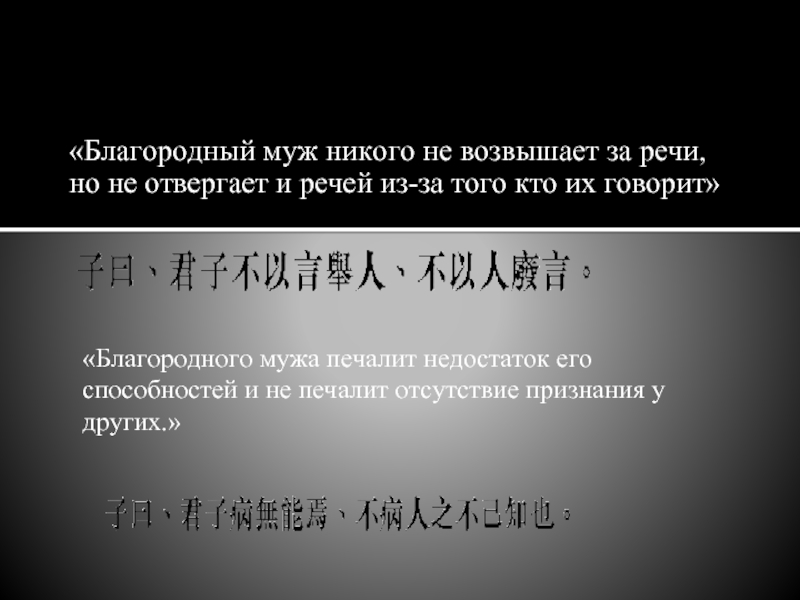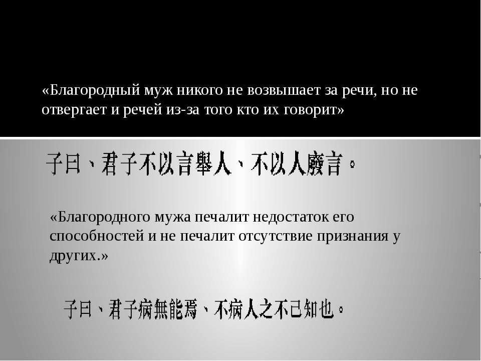 • Благородный человек не возвышает никого за речи, но не отвергает и речей из-за того, кто их говорит.