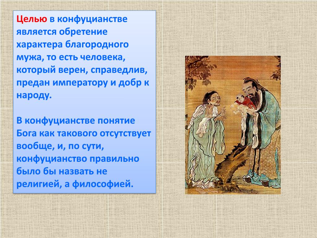 Вот некоторые основные положения учения Конфуция: Высшая цель жизни человека заключается в том, чтобы осознать и осуществить волю Бога, нравственные его законы, то есть проявлять подлинную сущность собственного «я».