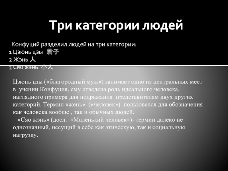 Конфуций противопоставлял «благородных мужей» (цзюнь цзы) «мелким людишкам» (сяожэнь): первые призваны управлять вторыми, служить им примером.
