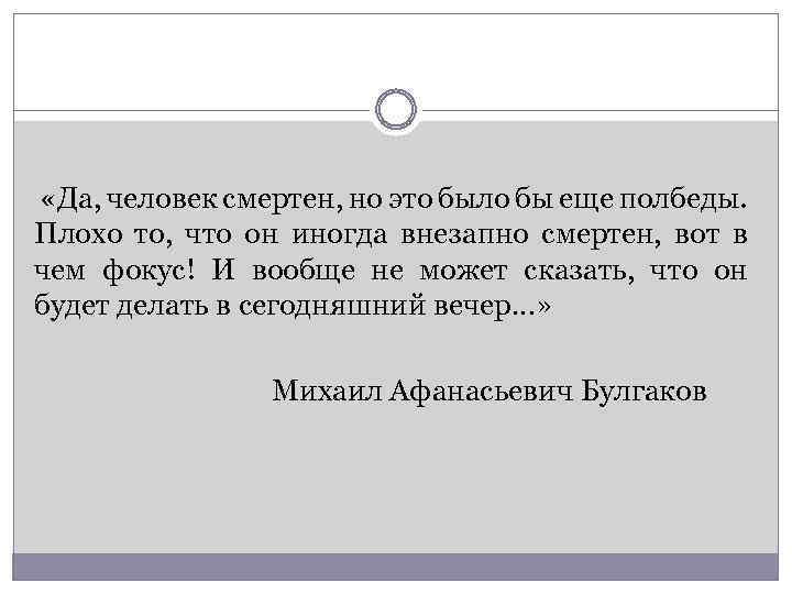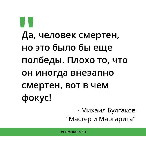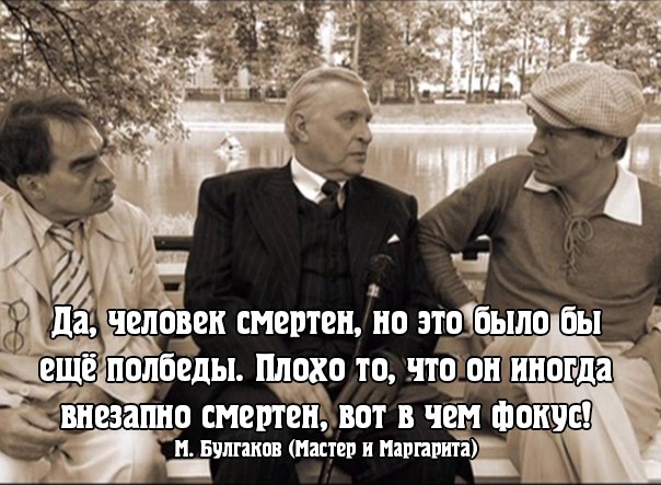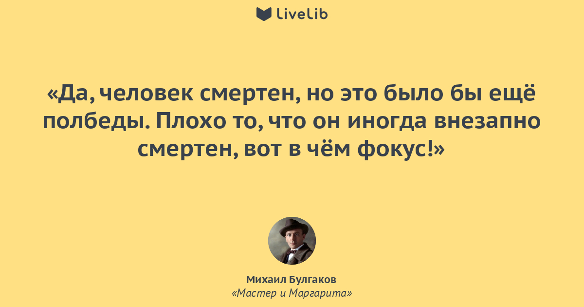 Да, человек смертен, но это было бы ещё полбеды. Плохо то, что он иногда внезапно смертен, вот в чем фокус!Михаил Булгаков «Мастер и Маргарита»