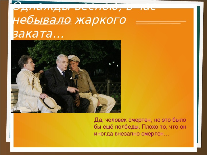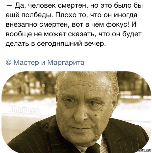 Я тоже любитель острых цитат. Вначале Воланд спорит: «Да, человек смертен, но это будет лишь полбеды. Хуже всего то, что он иногда неожиданно смертен — вот в чем хитрость! »