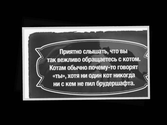 [Воланд]Приятно слышать, что вы так вежливо обращаетесь с котом. Котам обычно почему-то говорят «ты», хотя ни один кот никогда ни с кем не пил брудершафта.