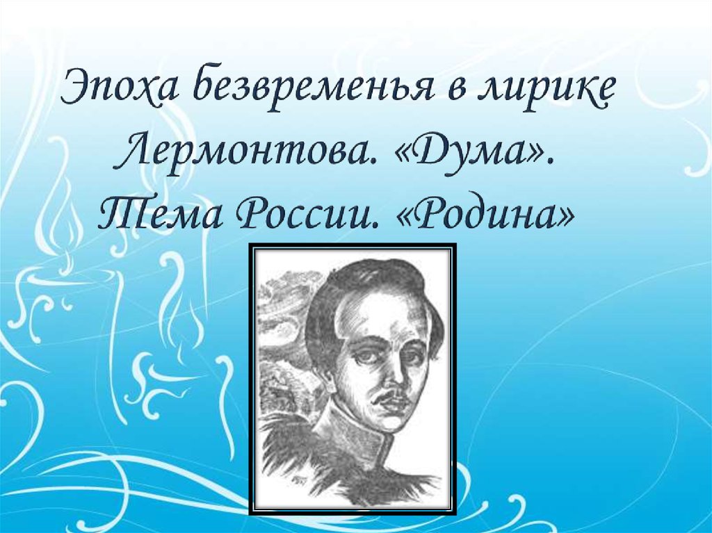 Цели: расширить представления о жизненном и творческом пути М.Ю. Лермонтова; показать связь между жизнью и творчеством поэта, ответить на вопрос, поставленный в теме урока; воспитывать эстетическое восприятие (через музыку, живопись и художественное слово)