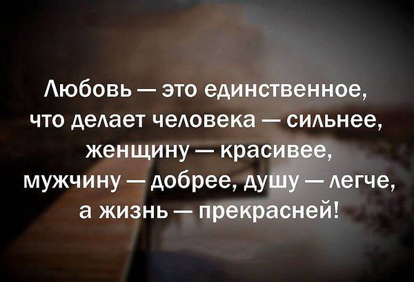 «Любовь это единственное, что делает человека сильнее, женщину красивее, мужчину добрее, душу легче, а жизнь прекрасней!» (Фридрих Ницше).
