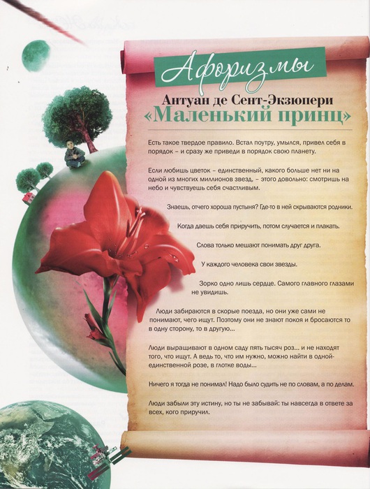 С помощью своих персонажей великие человеческие ошибки и заблуждения описал Антуан де Сент-Экзюпери. «Маленький Принц», цитаты из которого, как правило, являются изречениями странного мальчика, жителя невиданной планеты, стал книгой, которая заставила задуматься взрослых во всем мире о том, для чего они живут, что в их жизни главное, а что второстепенное.