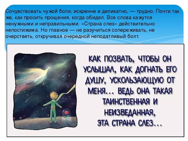 «Ведь все взрослые сначала были детьми, только мало кто из них об этом помнит» — Антуан де Сент-Экзюпери, из посвящения к книге.