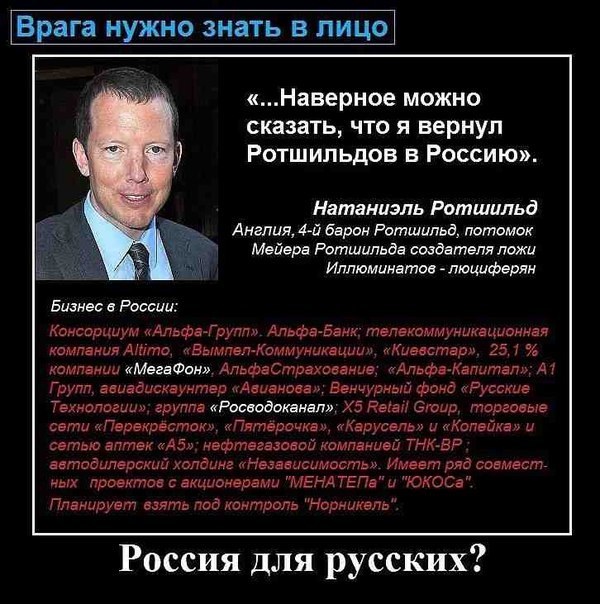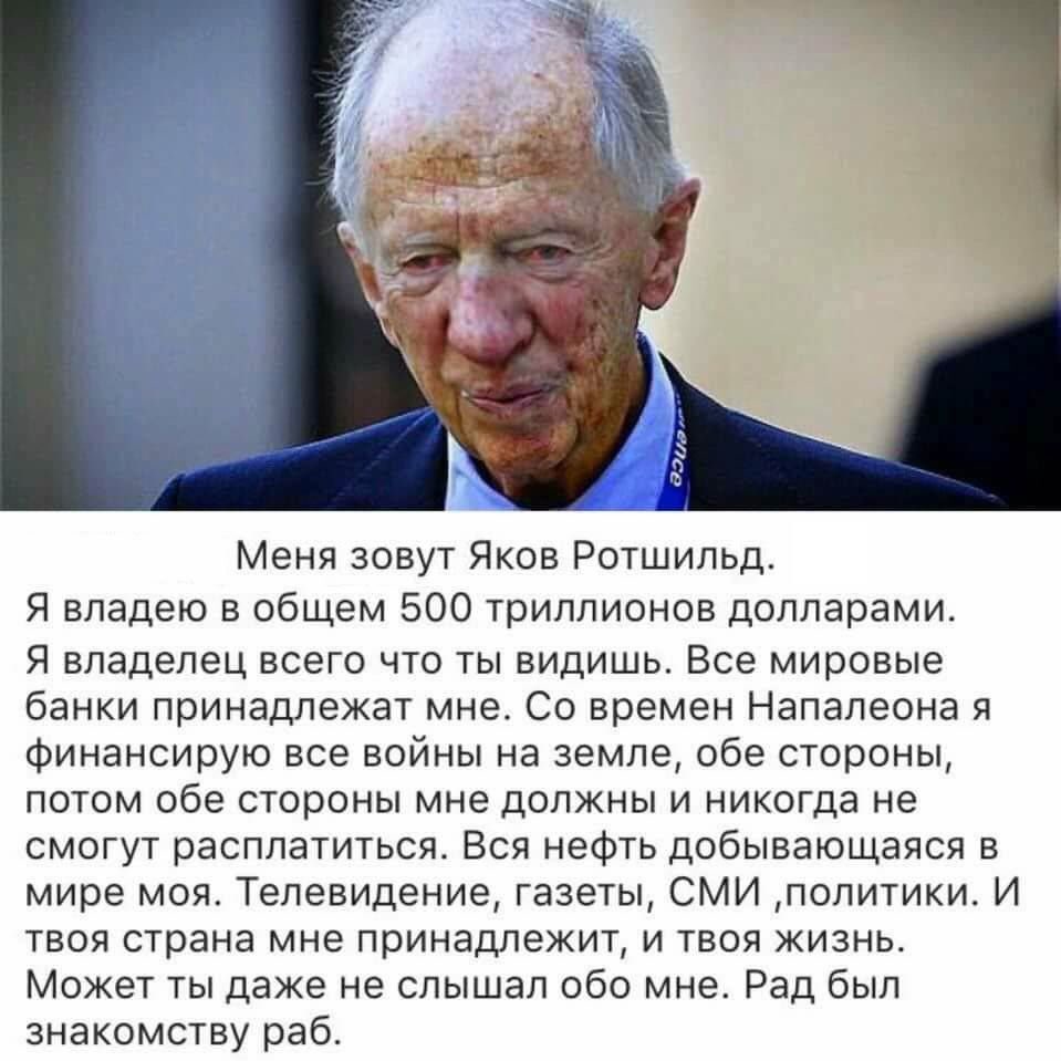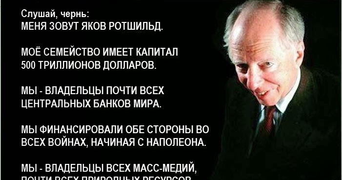 Натан Ротшильд: Нам требуется соглашение, договор, подписанный и гарантированный вашими правительствами, дающий нашему народу абсолютную свободу. По этому соглашению они потеряют свои цепи, у них будет право заниматься любой торговлей, владеть землей, жить с уважением и … помнить, что сказал наш отец, мама … ходить по миру с достоинством.Подробнее »