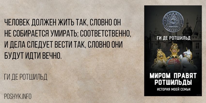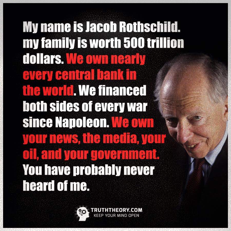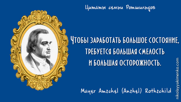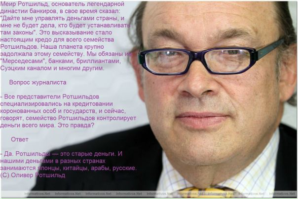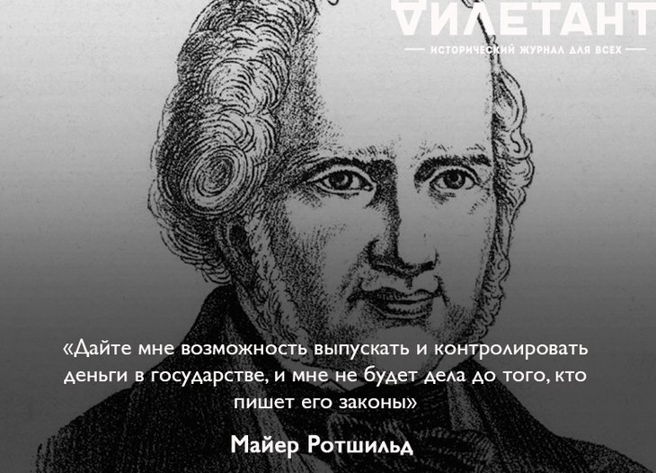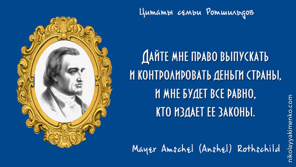 «Мейер [так в оригинале] Амшель Ротшильд, который основал большой международный банковский дом Ротшильдов, который, благодаря его аффилированности с европейскими центральными банками, до сих пор доминирует в финансовой политике практически всех стран мира, сказал:« Разрешите мне выпускать и контролировать деньги нации, и меня не волнует, кто издает ее законы ».