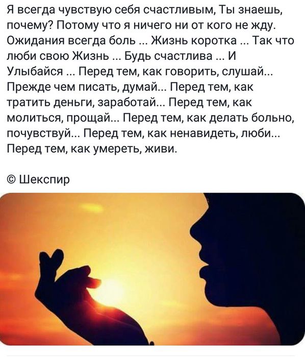 Делайте то что заставляет вас чувствовать себя счастливыми: Делайте то, что заставляет вас чувствовать себя счастливыми. Будьте с теми, кто заставляет вас улыбаться. Смейтесь, любите, пока живете. Не думайте о времени, не слушайте чужие мнения, и не думайте о том, что может быть потом. «Потом» может и не быть.