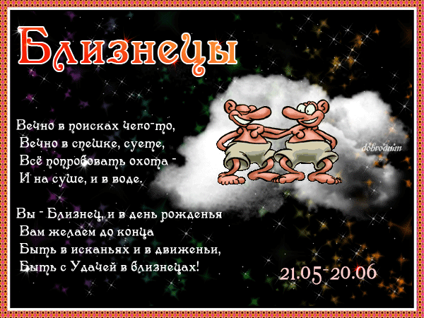 Близнецы являются третьим из двенадцати знаков зодиака и представлены созвездием Близнецов, которое состоит из Диоскуров — близнецов, Кастора и Поллукса.Если вы родились под этим знаком, вас считают энергичным, выразительным, умным и игривым. Близнецы известны своим общительным характером и разнообразными интересами, но они заработали (вероятно, неуместную) репутацию двуличных.