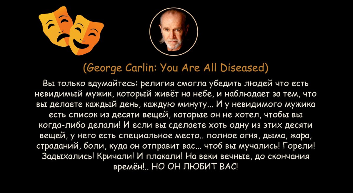 «Религия убедила людей, что на небе живет человек-невидимка, который наблюдает за всем, что вы делаете, каждую минуту каждого дня. И у человека-невидимки есть список из десяти конкретных вещей, которые он не хочет, чтобы вы делали. И если ты сделаешь что-либо из этого, он отправит тебя в особое место, где будут гореть, и огонь, и дым, и пытки, и страдания, чтобы ты жил вечно, и страдал, и горел, и кричал до скончания времен. Но он любит тебя. Он любит тебя и ему нужны деньги.