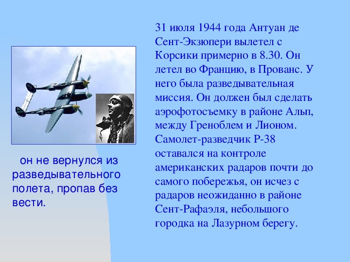 Спустя несколько месяцев, к большому огорчению его друзей и миллионов незнакомцев, полюбивших его благодаря его книгам, Сент-Экзюпери сам станет одним из потерянных пилотов, исчезнувших над Средиземным морем во время разведывательной миссии. звездная пыль тихо вернулась к звездам, которые его создали.