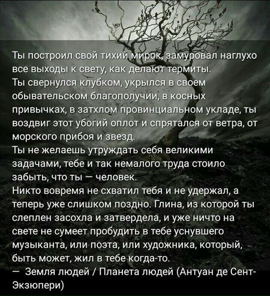 Ты свернулся клубком, укрылся в своем обывательском благополучии, в косных привычках, в затхлом провинциальном укладе, ты воздвиг этот убогий оплот и спрятался от ветра, от морского прибоя и звезд. Ты не желаешь утруждать себя великими задачами, тебе и так немалого труда стоило забыть, что ты — человек. Нет, ты не житель планеты, несущейся в пространстве, ты не задаешься вопросами, на которые нет ответа: ты просто-напросто обыватель города Тулузы. Никто вовремя не схватил тебя и не удержал, а теперь уже слишком поздно. Глина, из которой ты слеплен, высохла и затвердела, и уже ничто на свете не сумеет пробудить в тебе уснувшего музыканта, или поэта, или астронома, который, быть может, жил в тебе когда-то. — перевод Норы Галь