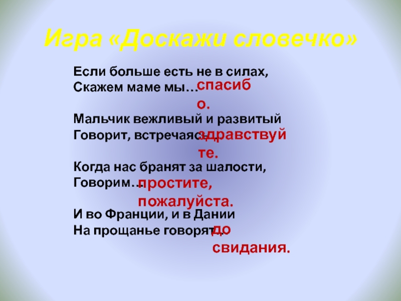 Если больше есть не в силах скажем мы ответы: «Растает и ледяная глыба от слова теплого …. СПАСИБО Мальчик вежливый и умненький говорит, встречаясь … ЗДРАВСТВУЙТЕ Если больше есть не в силах, скажем.». Скачать бесплатно и без регистрации.