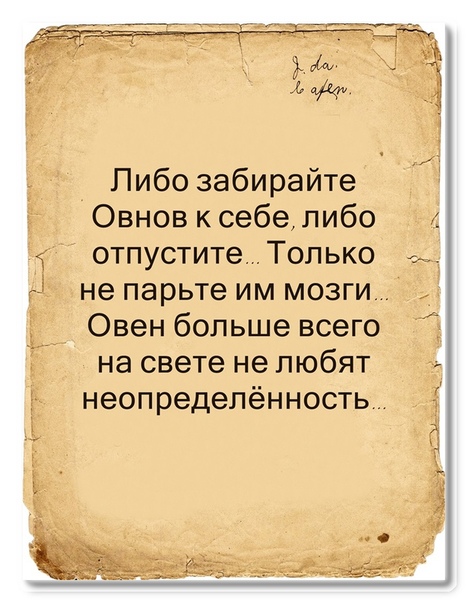 Однако, когда он хочет хорошо к вам относиться, это всегда имеет большое значение. Девиз Овна — «будь большим или иди домой» s o когда он хочет что-то сделать для вас, это монументальный . Его знак — это тот, который заставляет вас завтракать в постели, посылает вам на работу огромный букет цветов и дает вам любовные записки, написанные от руки, по прихоти, просто потому, что он этого хочет.Конечно, с ним сложно справиться, и если бы не его золотое сердце, немногие смогли бы принять вызов Овна.