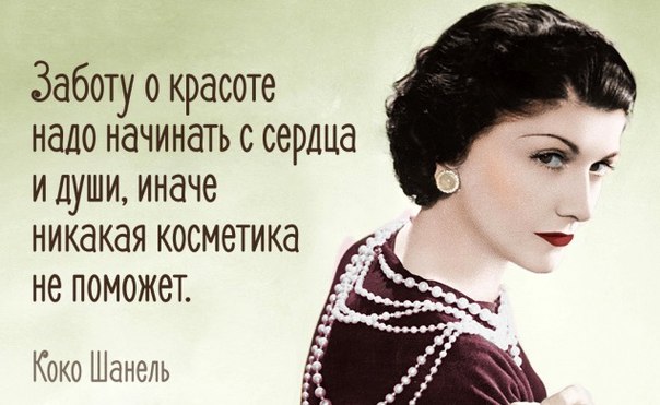 Габриэль Шанель«В 20 лет у женщины лицо, которое ей дала природа, в 30 – то, которое она сделала сама, а в 50 лицо надо заслужить»