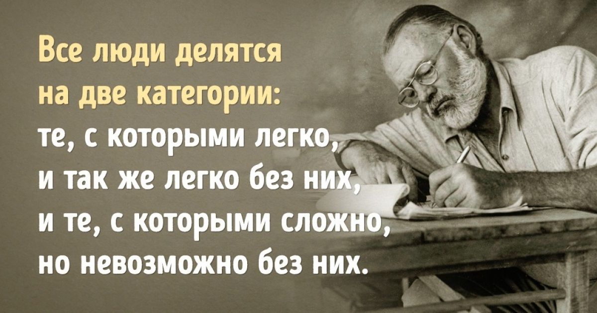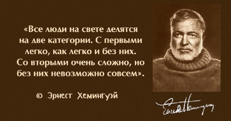 Главные цитаты Эрнеста Хемингуэя, которые много расскажут нам о самих себе: «Все люди на свете делятся на две категории. С первыми легко, как легко и без …