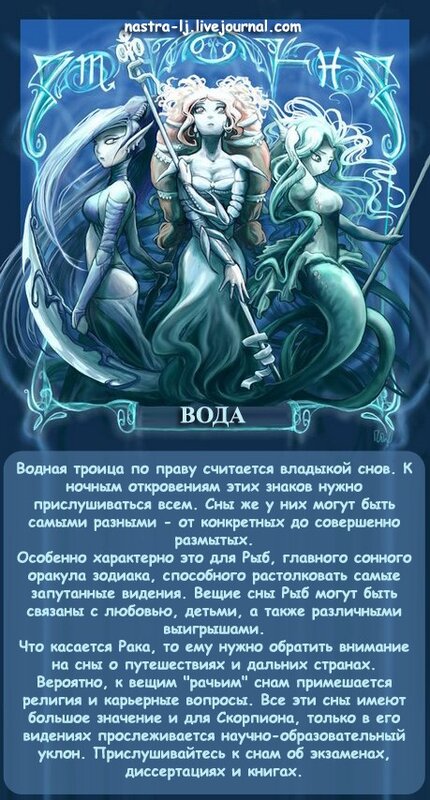 Во сне она каким-то образом “прокрутила” ситуацию назад и направила ее в другое русло (эта “игра”, похожа на сны Близнецов, ведь знаки – родственные, и тот и другой относятся к стихии воздуха). Так вот, огромный кусок штукатурки через некоторое время действительно отвалился в том самом месте, которое этой Водолейке снилось, но никого не задел, потому, что это произошло ночью. Бывают у Водолеев и высокоинтеллектуальные сны.