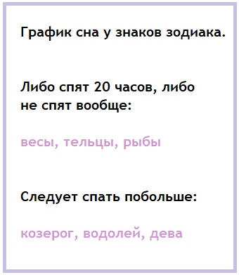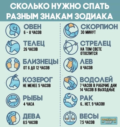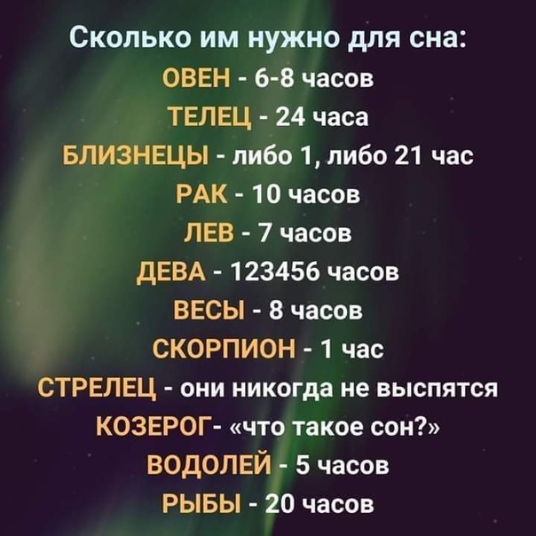 Ночью каждый человек должен отдыхать, однако, потребности в сне у всех разные. Когда человек спит, он набирается энергии, отдыхает позвоночник, мышцы, восстанавливаются защитные силы организма. Одним необходимо спать 10 часов для того, чтобы чувствовать себя бодрыми с утра, а другим достаточно и 7 часов полноценного сна. На то, как спят разные знаки Зодиака, также влияют планеты и звёзды.