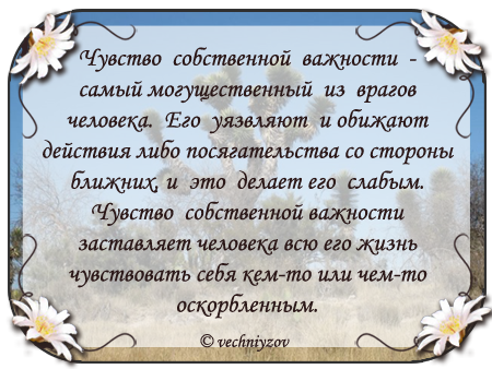 Давайте не путать чувство собственной важности с самоуважением, самоуважением или заботой о себе, которые являются здоровыми качествами, и их следует ценить и развивать.