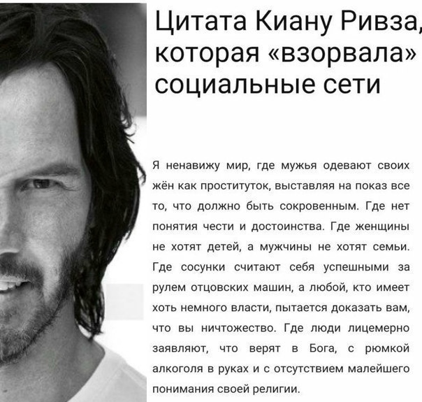 «Где женщины не хотят детей, а мужчины не хотят семьи.» У Киану Ривза нет жены и детей тоже нету. Всем известный факт. То есть он отрицает самого себя?.
