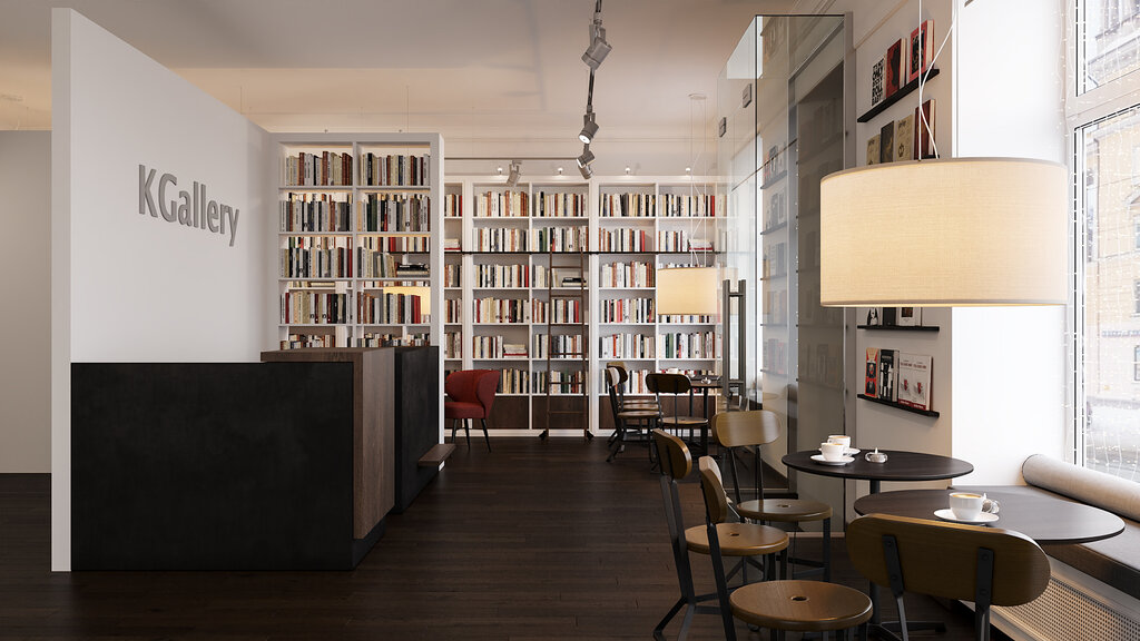 Книгоклуб может быть оформлен как смесь кафе и библиотеки, то есть столы, барная стойка, а вокруг стеллажи с книгами.