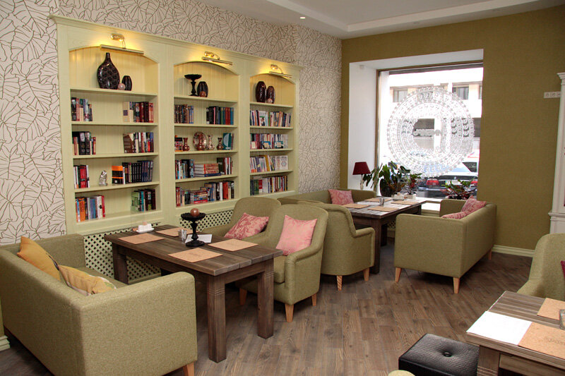 Приходить сюда можно без повода и с ним, одному или с друзьями, за сытным обедом или чтобы просто выпить чашечку чая. Нужно заметить, что пространство кафе вообще дает простор для выбора и содержимое книжных полок не является исключением.