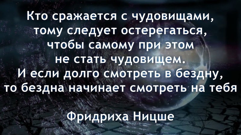 «Кто сражается с чудовищами, тому следует остерегаться, чтобы самому при этом не стать чудовищем. И если ты долго смотришь в бездну, то бездна тоже смотрит в тебя». Фридрих Ницше.