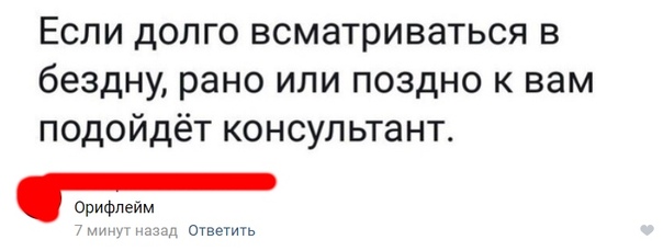 Прочтите еще раз внимательно мою маленькую историю. А что с бездной, ну думаю тут вопросов не возникнет. * Сохранена орфография и пунктуация автора«Если ты долго смотришь в бездну, то бездна смотрит в тебя»