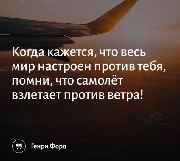 „Когда кажется, что весь мир настроен против тебя — помни, что самолёт взлетает против ветра.“
