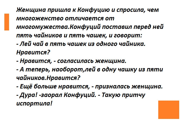 Женщина пришла к Конфуцию и спросила, чем многоженство отличается от многомужества. Конфуций поставил перед ней пять чайников и пять чашек, и говорит: — Лей чай в пять чашек из одного чайника. Нравится? — Нравится, — согласилась женщина. — А теперь, наоборот, лей в одну чашку из пяти чайников. Нравится? — Ещё больше нравится, — призналась женщина. — Дура! — заорал Конфуций, — Такую притчу испортила… — Спрашивалка