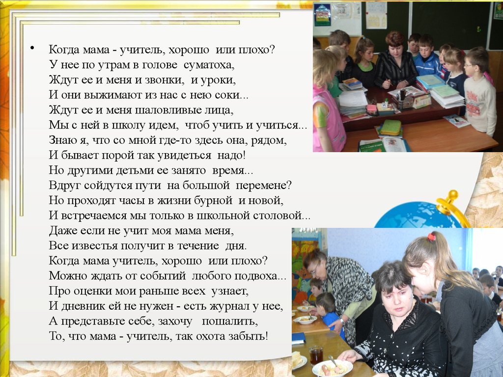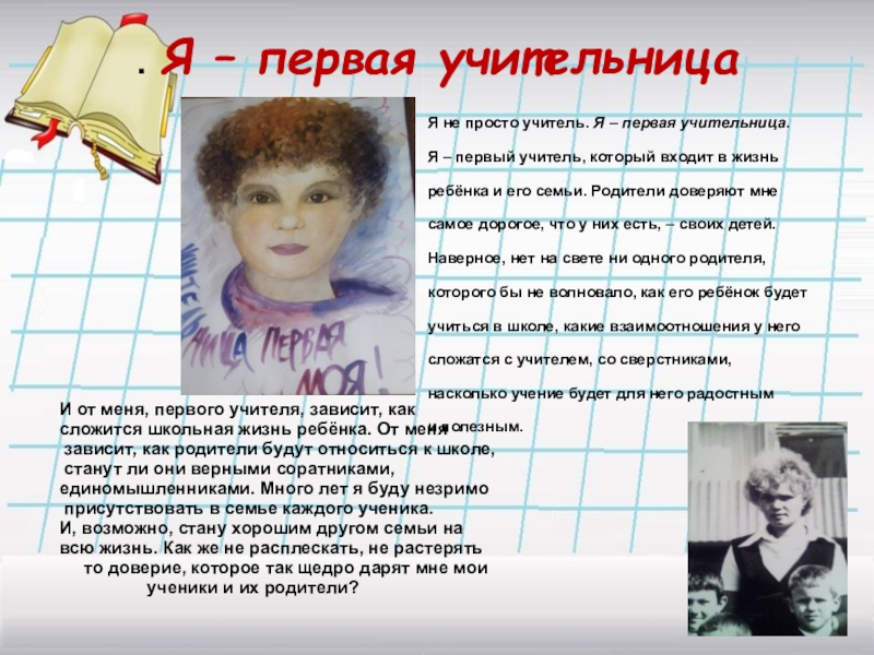 «Так сложилось в моей жизни, что профессию учителя я познала с двух сторон. С точки зрения ученика образ учителя для меня всегда был связан с понятием «самый-самый» — умный, красивый, добрый, справедливый… Но один нюанс не вписывался в понятие «самый-самый».