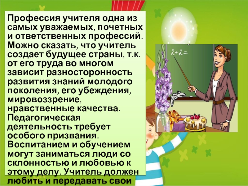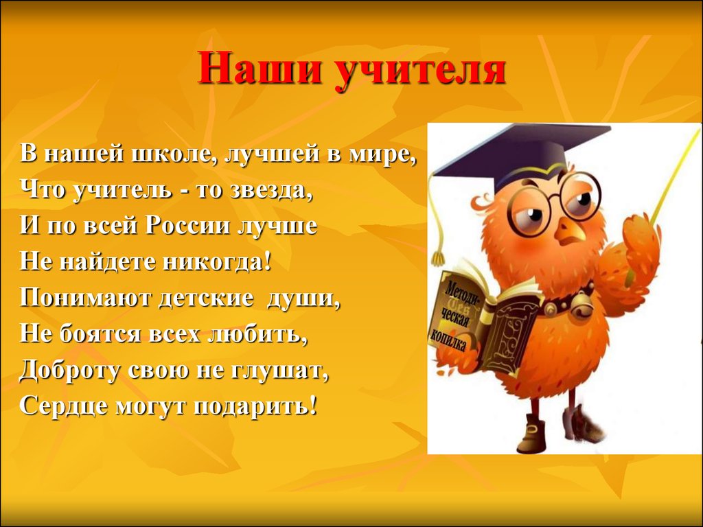 Лучший учитель, который у меня когда-либо былДэвид Оуэн Выдержки из Reader’s Digest (Asian Edition), апрель 1991 г. Мистер Уитсон преподавал естествознание в шестом классе. В первый день занятий он прочитал нам лекцию о существе по имени кошачий вампус, плохо приспособленном ночном животном, которое было уничтожено во время ледникового периода. Во время разговора он передавал череп. Мы все делали заметки, а позже устроили викторину. Когда он вернул мою бумагу, я был потрясен. Под каждым моим ответом стоял большой красный крестик. Я потерпел неудачу. Должна быть какая-то ошибка! Я точно записал то, что сказал мистер Уитсон. Потом я понял, что все в классе потерпели неудачу. Что произошло? Очень просто, объяснил мистер Уитсон. Он выдумал все, что касается кэттивампуса. Такого животного никогда не было. Таким образом, информация в наших заметках была неверной. Ожидали ли мы признания за неправильные ответы? Излишне говорить, что мы были возмущены. Мы должны были догадаться, сказал мистер Уитсон. В конце концов, в каждую минуту, когда он передавал череп кошачьего вампуса (правда, кошачий), разве он не говорил нам, что от животного не осталось и следа? Он описал ее удивительное ночное видение, цвет ее меха и множество других фактов, о которых он не мог знать. Он дал животному нелепое имя, и мы до сих пор ничего не заподозрили. Он сказал, что нули в наших работах будут записаны в его зачетной книжке. И они были. Мистер Уитсон сказал, что надеется, что мы чему-то научимся из этого опыта. Учителя и учебники не безупречны. На самом деле никого нет. Он сказал нам не позволять нашим разумам заснуть и говорить, если мы когда-нибудь сочтем, что он или учебник неправы. Каждое занятие с мистером Уитсоном было приключением. Я до сих пор помню некоторые научные периоды почти от начала до конца. На днях он сказал нам, что его Фольксваген был живым организмом. Мы принесли наш совершенно новый скептицизм во все наши классы. Это создавало проблемы для других учителей, которые не привыкли к вызовам. Наш учитель истории читал о чем-то лекцию, а потом кто-то откашлялся, и кто-то сказал: «Кэттивампус». Если меня когда-нибудь попросят предложить решение проблем в наших школах, это будет мистер Уитсон. Я не сделал никаких великих научных открытий, но занятия мистера Уитсона дали мне и моим однокурсникам нечто столь же важное: смелость смотреть людям в глаза и говорить им, что они не правы. Он также показал нам, что вы можете получать удовольствие, делая это. Не все видят в этом ценность. Однажды я рассказал учителю начальной школы о мистере Уитсоне. Что делают учителя? Гости ужина сидели за столом и обсуждали жизнь. Один человек, генеральный директор, решил объяснить проблему с образованием. Он утверждал: «Чему ребенок может научиться у того, кто решил, что его лучший выбор в жизни — стать учителем?» Он напомнил другим гостям ужина, что они говорят об учителях: «Кто может, тот делает. Кто не может, учит». Чтобы подчеркнуть свою точку зрения, он сказал другому гостю; «Вы учитель, Сьюзан. Скажите честно. Чем вы занимаетесь?» Сьюзан, известная своей честностью и откровенностью, ответила: Хотите знать, что я делаю? Я заставляю детей работать усерднее, чем они когда-либо думали. Я заставляю C+ чувствовать себя обладателем Почетной медали Конгресса. Я заставляю детей просидеть 40 минут в учебном зале в аб