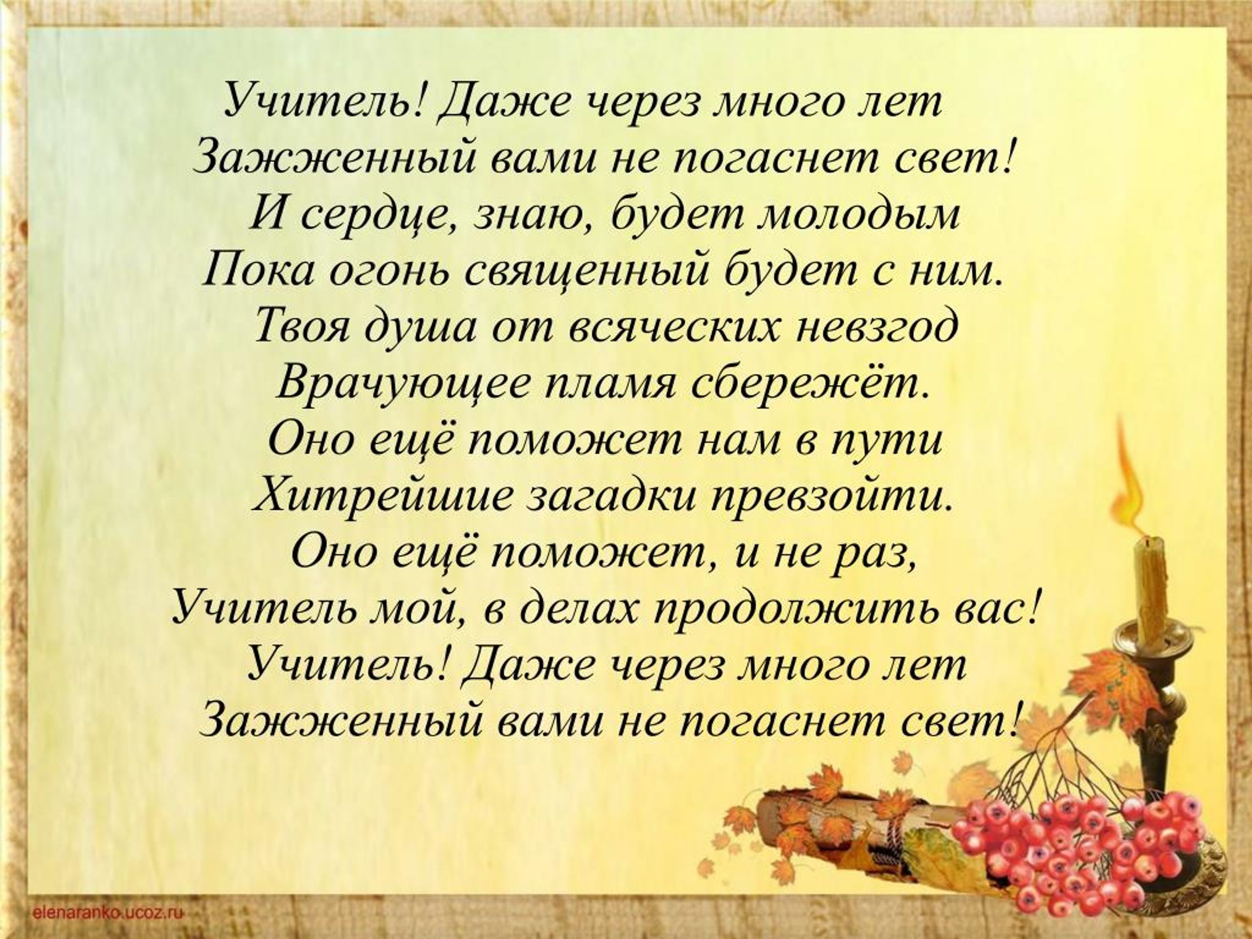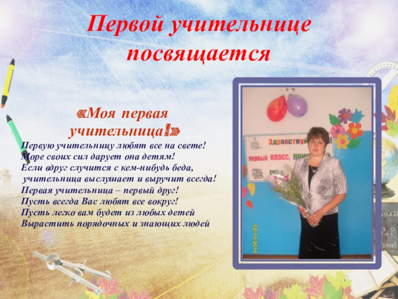 Она была строга, в руках у неё была указка. Камнем преткновения для меня было написание «Классная работа», т.к., хоть убей, я не понимала, от какой точки на тетрадном листе надо начинать писать. Сестра говорила, отступи несколько строчек сверху и сколько-то слева. «Сколько?» — мрачно спрашивала я. «Неважно, несколько, четыре, пять, чуть-чуть…» — отвечала сестра. «Сколько?» — обречённо повторяла я. Я успокаивалась и начинала старательно выводить буквы только тогда, когда её палец вонзался в страницу, а моя ручка, испачкав его со всех сторон, в поисках заветной точки, находила ту единственную, заветную, одобренную Учителем. Не знаю, как так вышло, но благодаря моей сестре, когда дело дошло до школы, меня хотели взять сразу во второй класс! Спасибо тебе, мой родной, мой любимый Первый Учитель!»