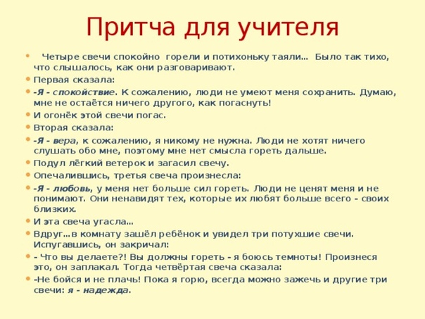 себя и друг друга. Несколько лет спустя один из студентов был убит во Вьетнаме, а его Учитель присутствовал на похоронах этого особенного ученика. Она никогда не видела военнослужащий в военном гробу перед. Он выглядел таким красивым, таким зрелым. Церковь была битком набита его друзьями. Один за другим, те, кто любил его прошла последняя прогулка у гроба. Учитель был последним, кто благословлял гроб. Пока она стояла там, подошел один из солдат, несших гроб. ей. — Вы были учителем математики Марка? он спросил. Она кивнула: «Да». Затем он сказал: «Марк много говорил о тебе». После похорон большинство бывших одноклассников Марка вместе пошли на обед. Мать и отец Марка были там, явно ожидая возможности заговорить. со своим учителем. — Мы хотим тебе кое-что показать, — сказал отец, доставая из кармана бумажник. Открыв бумажник, он осторожно вынул два потертых листа бумаги из блокнота, которые, очевидно, были заклеены скотчем, сложены и снова сложены много раз. раз. Учительница знала, не глядя, что бумаги были теми, на которых она перечислил все хорошее, что каждый из одноклассников Марка сказал о нем. «Большое спасибо за это, — сказала мать Марка. видишь ли, Марк дорожил этим.» Все бывшие одноклассники Марка начали собираться вокруг. Чарли улыбнулся довольно застенчиво и сказал: «У меня все еще есть мой список. Он в верхнем ящике мой рабочий стол дома.» Жена Чака сказала: «Чак попросил меня вставить его в наш свадебный альбом». — У меня тоже есть, — сказала Мэрилин. «Это в моем дневнике» Затем Вики, еще одна одноклассница, полезла в свой бумажник, достала бумажник и показала группе свой потрепанный список. Вот когда учитель наконец сел и заплакал. Она плакала из-за Марка и для всех его друзей, которые больше никогда его не увидят. Плотность людей в обществе настолько велика, что мы забываем, что жизнь закончится в один прекрасный день. И мы не знаем, когда наступит этот день. Так что, пожалуйста, скажите людям, которых вы любите и о которых заботитесь, что они особенные и важно. Скажи им, пока не поздно. |