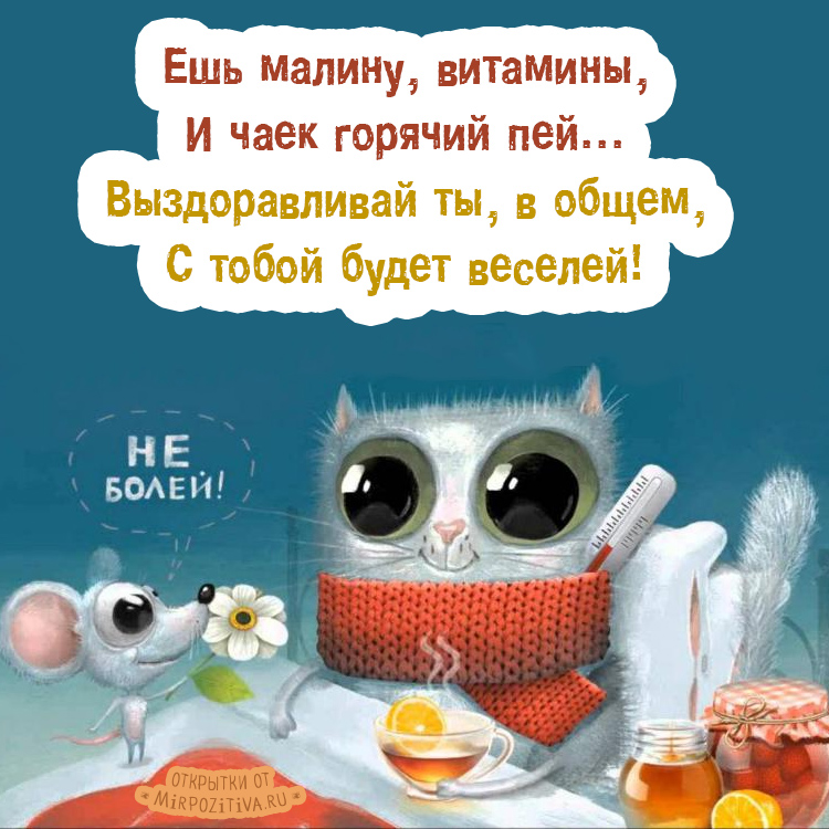 Для быстрейшего выздоровления нужны позитивные эмоции, поэтому выполняй с улыбкой назначенные процедуры и не падай духом! Пусть все выписанные доктором пилюли будут сладкие, компрессы — нежные, а температура не скачет вверх и вниз и возвращается в норму. Твоему иммунитету мы желаем окрепнуть и одержать безоговорочную победу!
