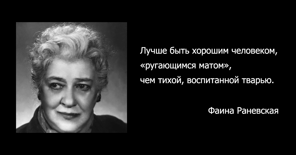 Раневская Фаина, урожденная Фанни Фельдман, прославилась не только десятками прекрасных ролей в кино и театре. Ее цитаты давно превратились в афоризмы, и разошлись сотнями тысяч по бескрайним просторам Интернета, как в виде картинок, так и в виде самых разнообразных подборок текста и статусами в социальных сетях типа Вконтакте или Фэйсбук.