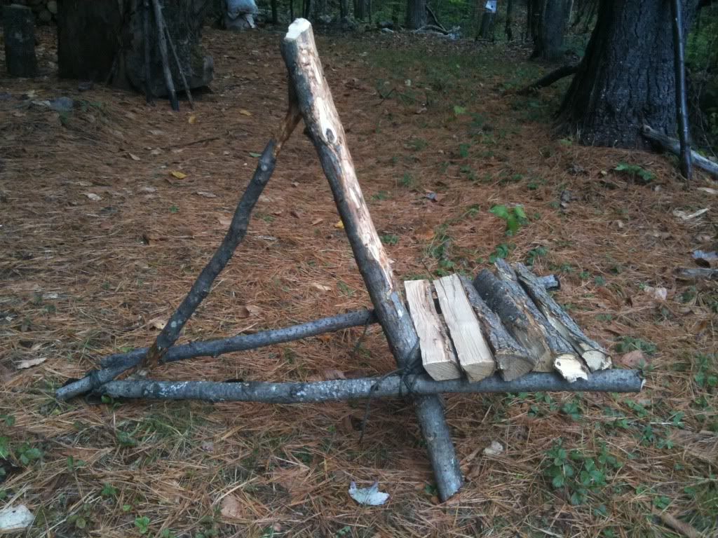 Соорудив А-образную раму штатива из 4 или более цельных веток и привязав к ней одеяло или брезент, вы можете сделать очень удобное одноместное походное кресло, идеально подходящее для того, чтобы держать вашу задницу подальше от холодной земли.