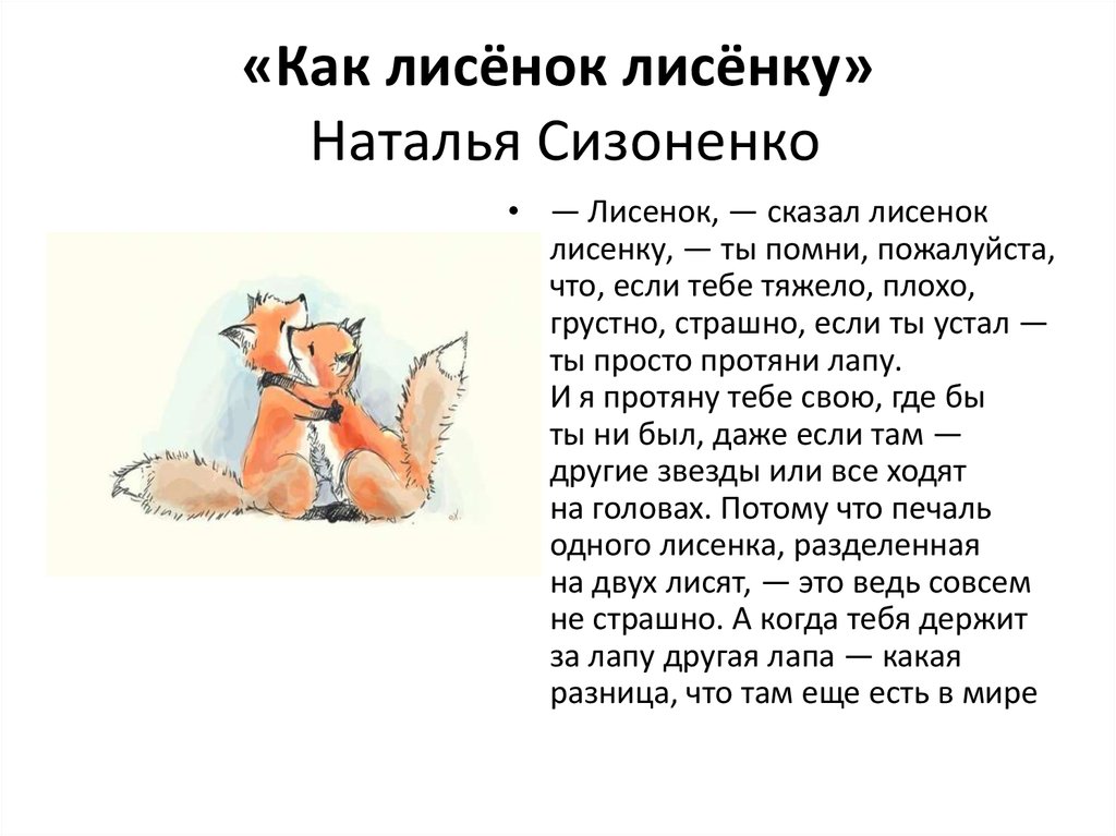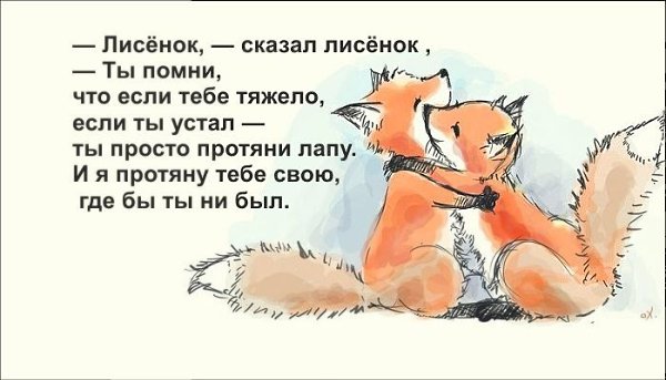 «- Лисёнок, — сказал лисёнок лисёнку, — ты помни, пожалуйста, что если тебе тяжело, плохо, грустно, страшно, если ты устал — ты просто протяни лапу.