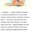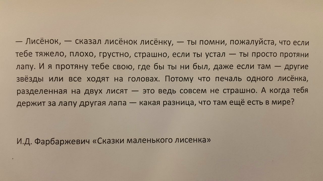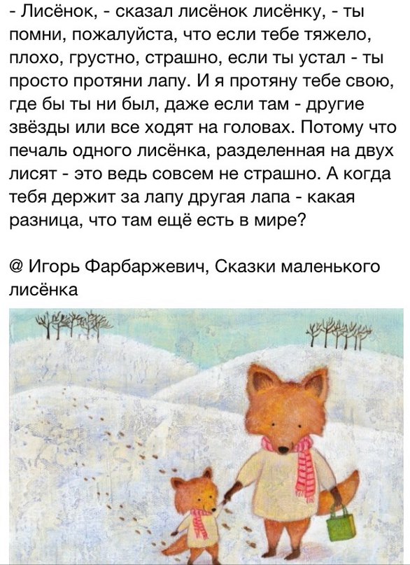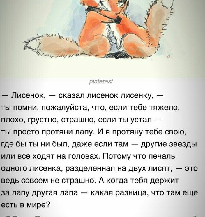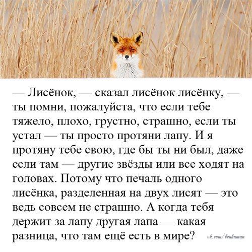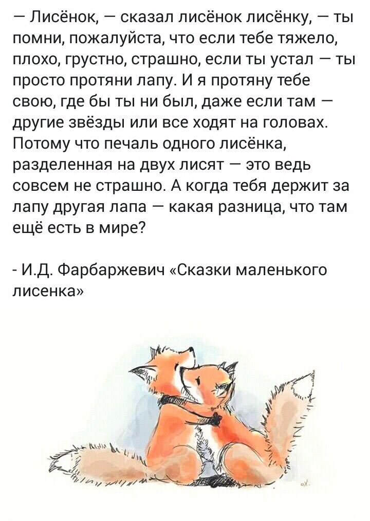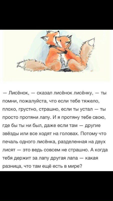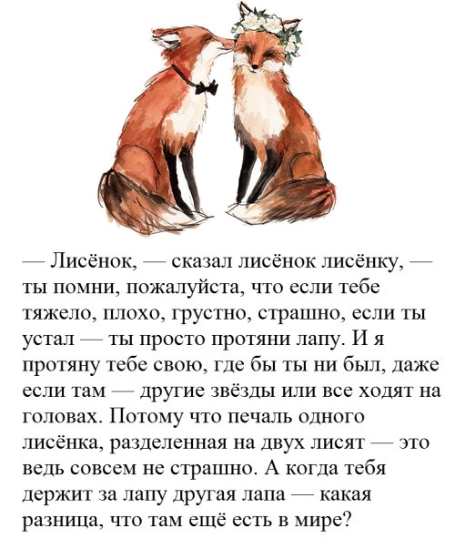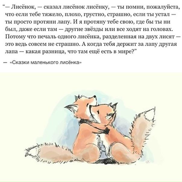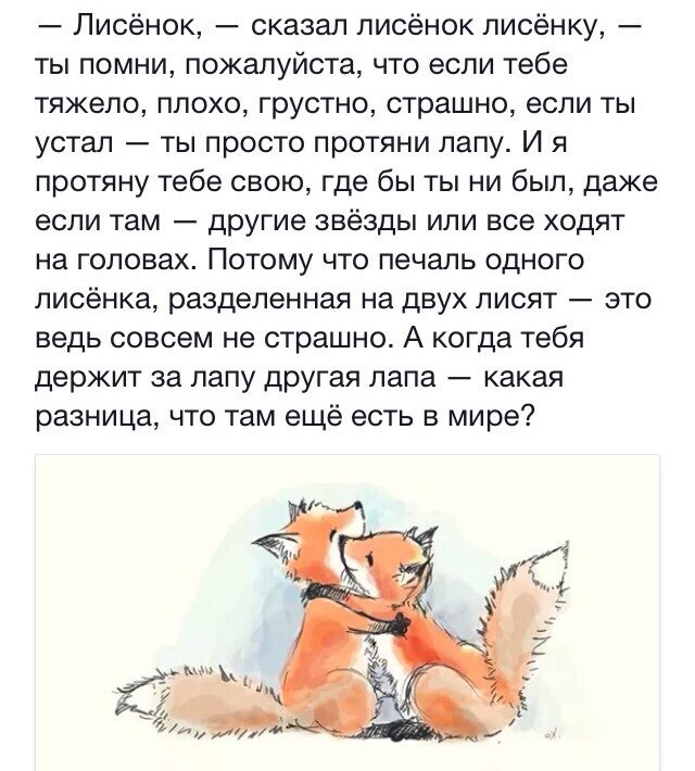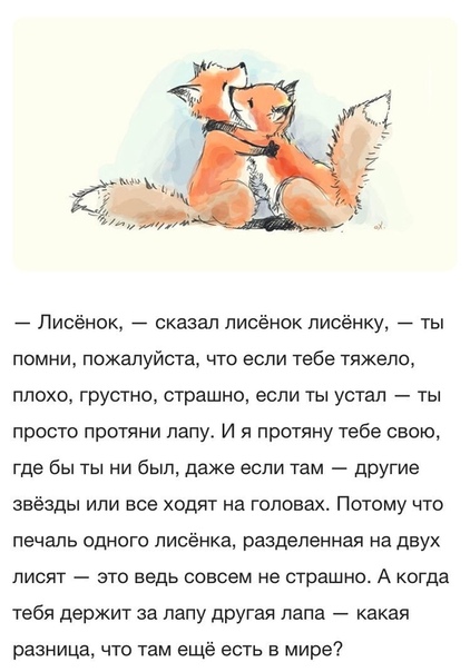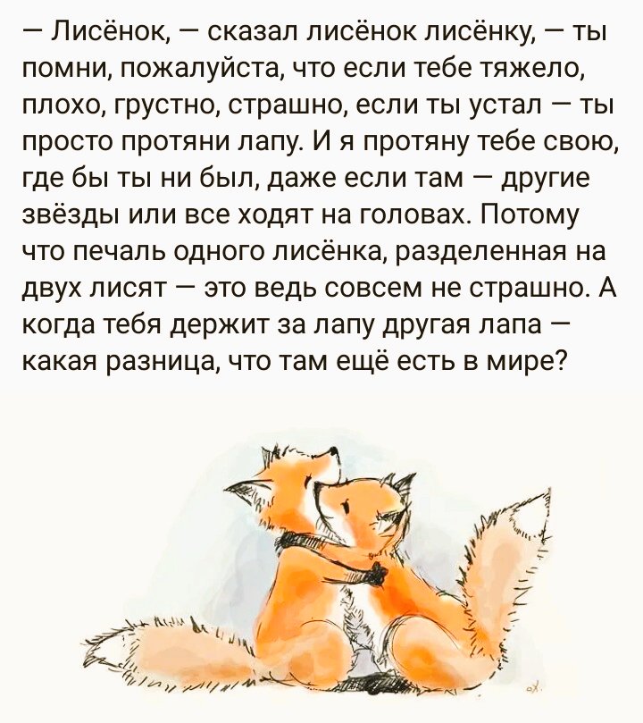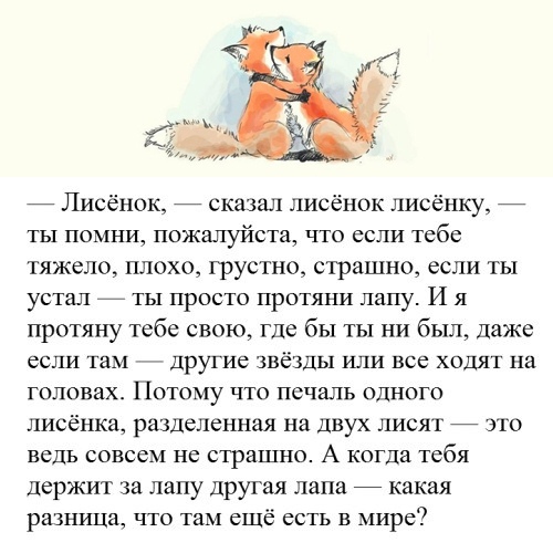 — Лисёнок, — сказал лисёнок лисёнку, — ты помни, пожалуйста, что если тебе тяжело, плохо, грустно, страшно, если ты устал — ты просто протяни лапу. И я протяну тебе свою, где бы ты ни был, даже если там — другие звёзды или все ходят на головах. Потому что печаль одного лисёнка, разделенная на двух лисят — это ведь совсем не страшно. А когда тебя держит за лапу другая лапа — какая разница, что там ещё есть в мире?