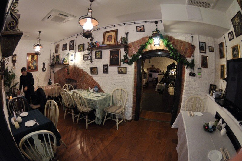 Пространство ресторана разделено на разные залы, каждая из которых оформлена в индивидуальном стиле. Самое простое и веселое кафе — на первом этаже; прекрасный ресторан на втором этаже; и более темное, более клубное кафе-библиотека наверху.Ясно, что он настоятельно рекомендуется для гостей Москвы, которые хотят приобщиться к русской истории и культуре. Окружите себя книгами Пушкина, Гоголя, Толстого, Чехова и Достоевского.