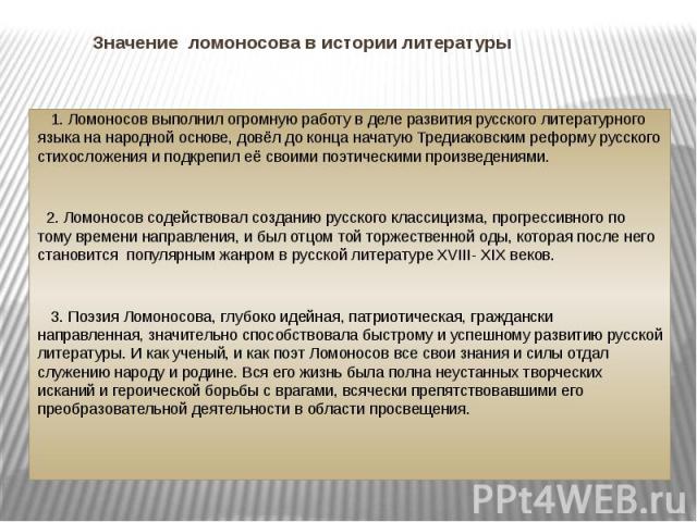 « С Ломоносова , — писал Белинский, — начинается наша литература. » Ломоносов был основоположником русской грамматики. Благодаря Ломоносову на смену мертвым, схоластическим схемам старой грамматики пришла новая грамматика, основанная на живой русской речи. Как поэт Ломоносов выступал прежде всего со стихами, в которых призывал к развитию искусств и наук в России, к распространению Просвещения среди русского народа.