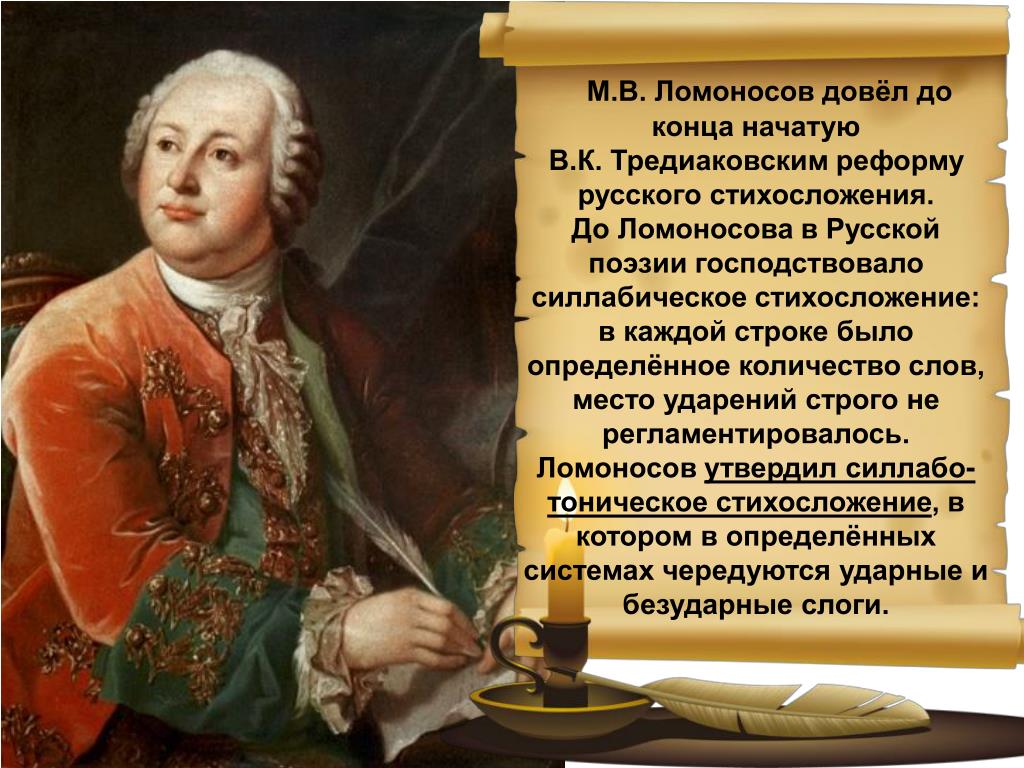 До Ломоносова в Русской поэзии господствовало силлабическое стихосложение ( силлаби по-гречески – слог ): в каждой строке было определённое количество слов, место ударений строго не регламентировалось.
