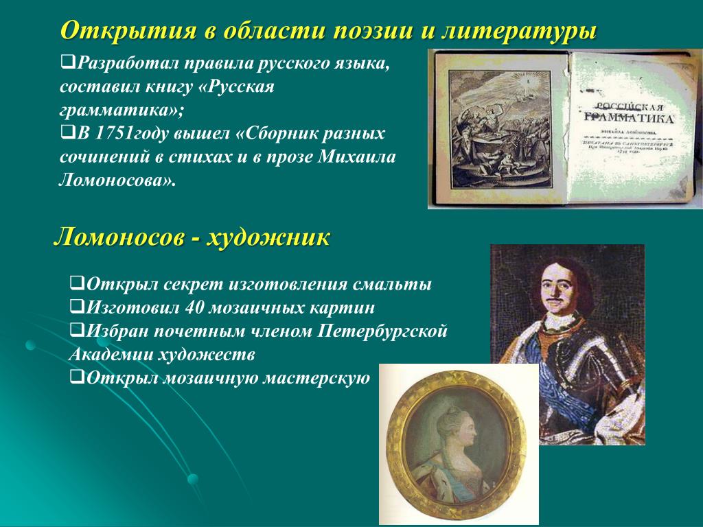 Каким бы крупным ученым ни был Ломоносов, его влияние на развитие искусства в России, особенно литературы, было гораздо больше. Возродил древнее искусство мозаики в России, был фольклористом, поэтом, драматургом, историком, филологом. В 1755 году Ломоносов способствовал основанию Московского университета, который сегодня носит его имя как Университет Михаила Ломоносова.