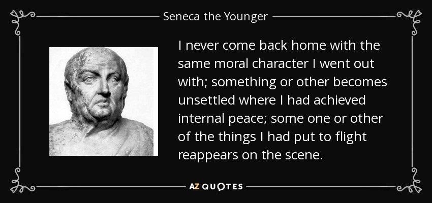 Действительно, стоики подчеркивают, что чтобы жить хорошо, нужно жить согласно природе. В текстах Сенеки этот акцент дает основу для критики его культуры и других римлян. Чтобы следовать природе или жить в соответствии с природой, необходимо отказаться от многих практик и ценностей, усвоенных посредством аккультурации.Возвращение Сенеки в его философских трудах к опасностям общественной жизни, толп и социальных эксцессов основывается на том, что большая часть общества коррумпирована. Жить так, как думает толпа, — значит отходить от природы. Сенека отмечает в письме Letter 46, что разум требует, чтобы человек жил в соответствии со своей собственной природой, но эту природу можно сбить с пути.