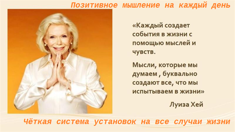 Сегодня день, когда вы должны начать создавать радостную, наполненную жизнь. Сегодня тот день, когда нужно начать освобождаться от всех своих ограничений. Сегодня тот день, когда вы узнаете секреты жизни. Вы можете изменить свою жизнь к лучшему. У вас уже есть инструменты внутри вас, чтобы сделать это. Этими инструментами являются ваши мысли и ваши убеждения. ~ Луиза Хей - Начните слушать, что вы говорите. Не говорите того, что не хотите, чтобы для вас стало правдой. ~ Луиза Хей