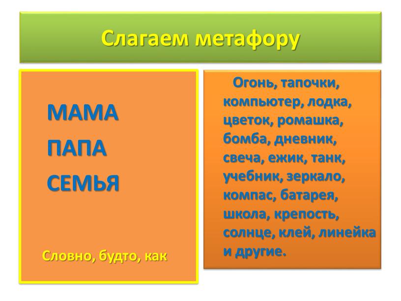 Длительный или устойчивые метафоры .: если предложение содержит группу метафор; состоит из основной (центральный образ устойчивой метафоры) и способствующий изображения (другие слова, относящиеся к центральному изображению)